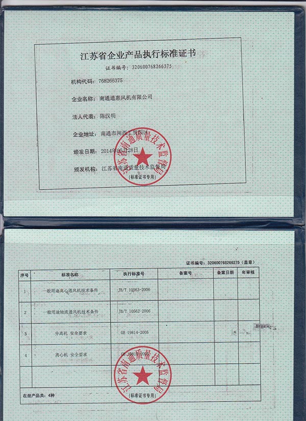 江蘇省企業(yè)產(chǎn)品執行標準證書(shū)